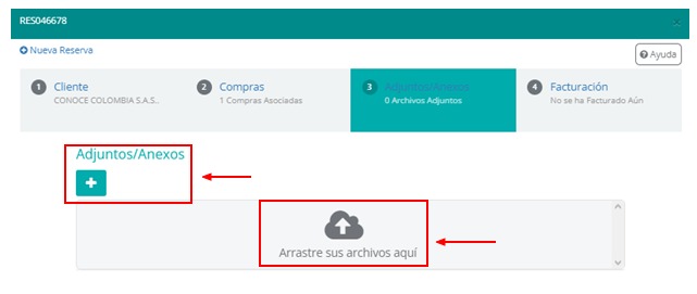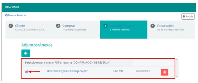 Para anexar un documento (itinerario), es necesario ir a la ventana de detalle de la reserva y seleccionar la sección Adjuntos/Anexos. El paso siguiente es agregar el itinerario en formato PDF, ya sea haciendo clic en el botón adjuntar (+) o simplemente arrastrando el archivo en la zona indicada: