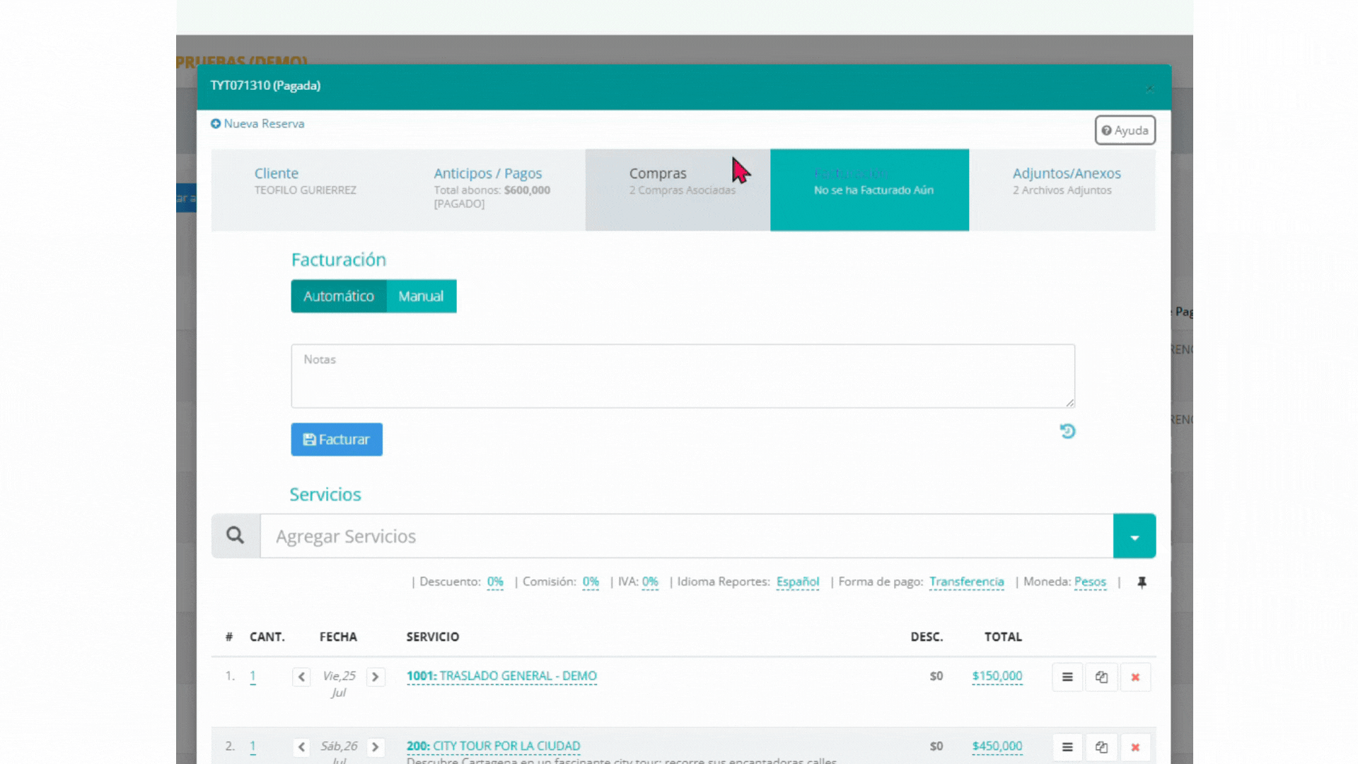 Para facturar una reserva, se debe ingresar a la reserva correspondiente y verificar previamente que se haya solicitado al equipo de soporte la activación con Siigo o Alegra. Luego, se debe acceder al módulo “Facturación” ubicado en la parte superior derecha y seleccionar el botón “Automático”. Si se desea, se puede agregar una nota. Al hacer clic en “Facturar”, el sistema tomará automáticamente la numeración del sistema contable. Para finalizar el proceso, dar clic en «Guardar».